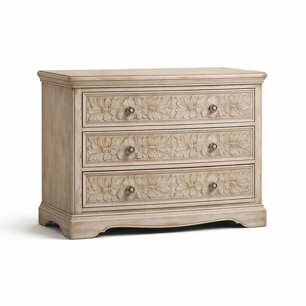 Commode en bois massif sculpté beige avec 3 tiroirs 90x40x85 cm
