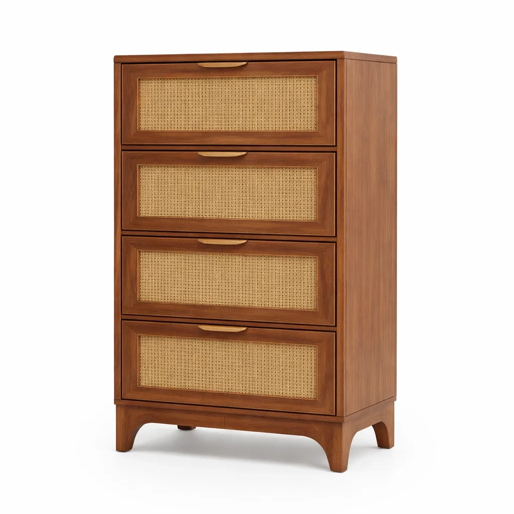 Commode en bois et rotin avec 4 tiroirs marron clair