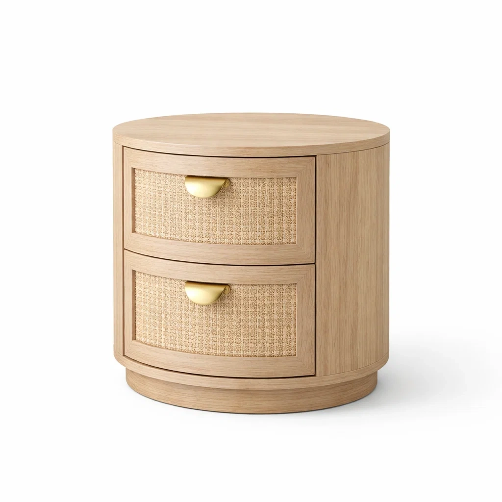 Cette table de chevet présente une construction élégante avec un cadre en bois naturel et des tiroirs en rotin. Les poignées en laiton ajoutent une touche raffinée.