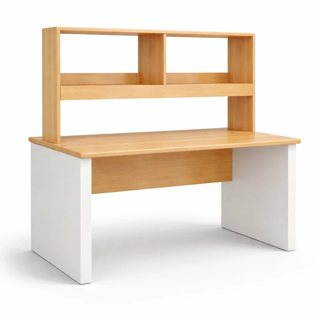 Le bureau est fabriqué en panneaux de particules plaqué chêne pour le plateau et en MDF pour le cadre. Il mesure 120 cm de longueur, 60 cm de largeur et 140 cm de hauteur. La couleur du plateau est en chêne clair tandis que le cadre est blanc. Ce meuble est doté de 2 étagères et ne dispose pas de tiroirs. Le poids net est de 30 kg.