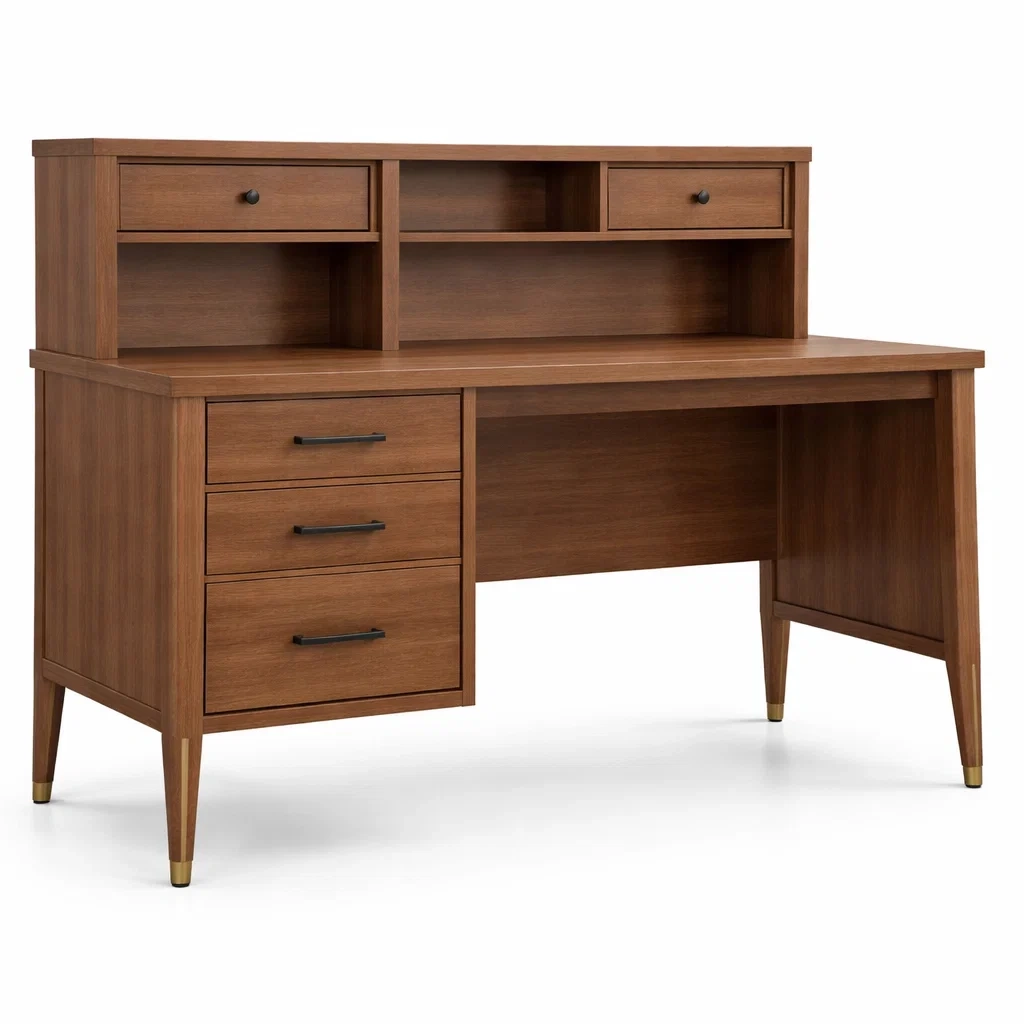 Ce bureau est fabriqué en panneau de particules plaqué chêne avec une teinte naturelle de chêne. Ses dimensions sont de 120 cm x 60 cm x 140 cm. Le bureau comprend des étagères supérieures et trois tiroirs pour un rangement pratique.