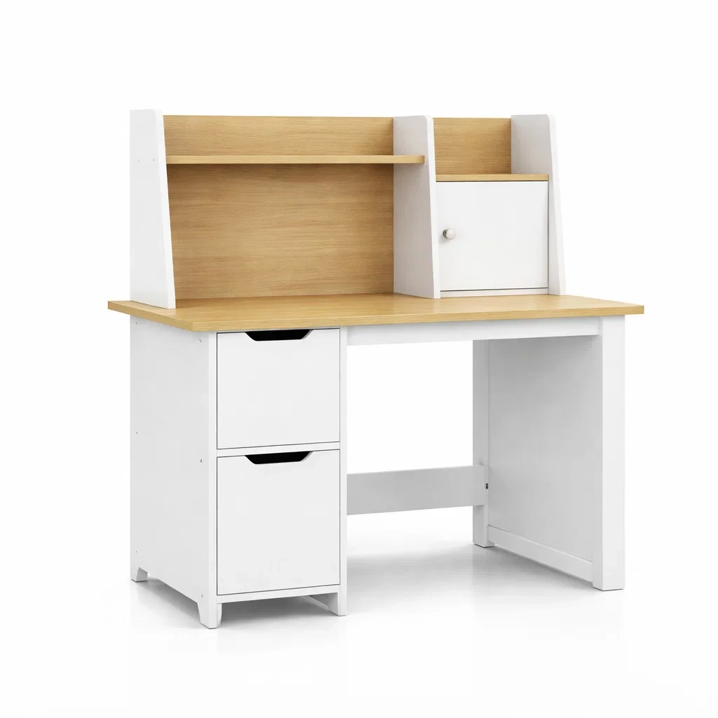 Ce bureau est fabriqué en MDF avec un placage en bois naturel pour la surface et une structure en MDF solide. Il est doté de deux tiroirs et de deux étagères intégrées offrant un espace de rangement pratique. Une porte de placard est également incluse. Le bureau est blanc avec des éléments de couleur bois naturel. Les dimensions sont de 100 cm de longueur, 50 cm de largeur et 120 cm de hauteur. Poids total: 25 kg.