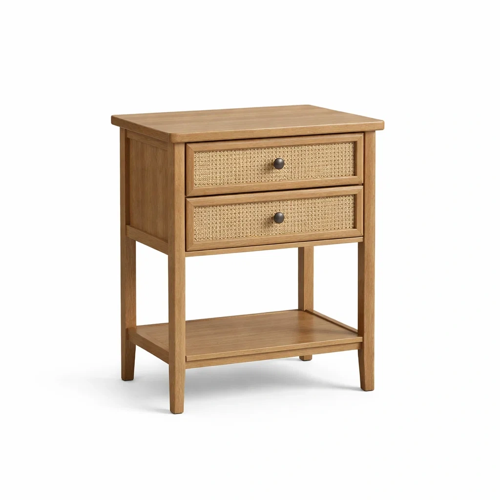 Cette table de chevet est fabriquée en chêne massif avec une façade de tiroirs en rotin tressé. Elle mesure 60 cm de hauteur, 45 cm de largeur et 35 cm de profondeur. Le poids total est de 9.5 kg.