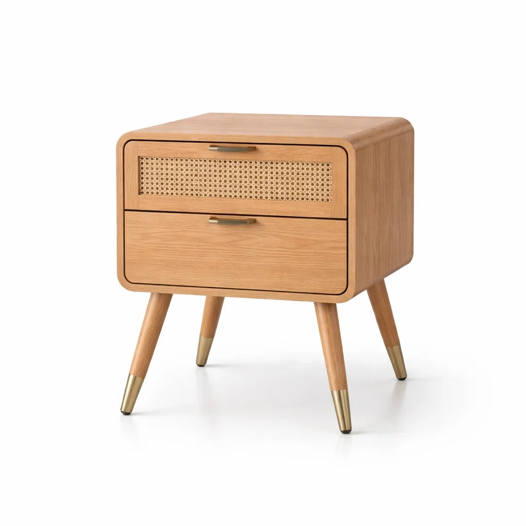 Matériau : Chêne massif avec cannage en rotin, pieds en bois et embouts en métal.
