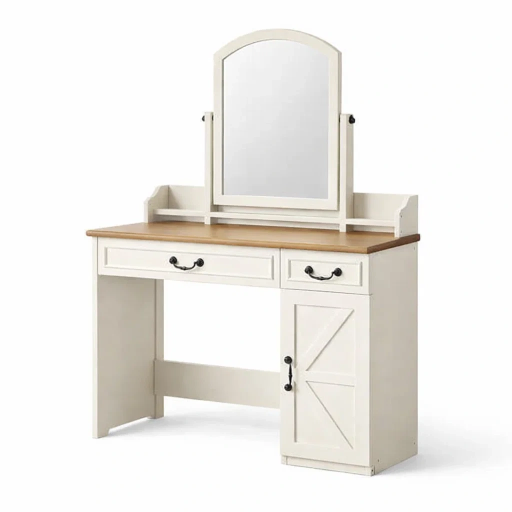 Caractéristiques : Rangement avec tiroirs et compartiment, miroir fixe, poignées métalliques