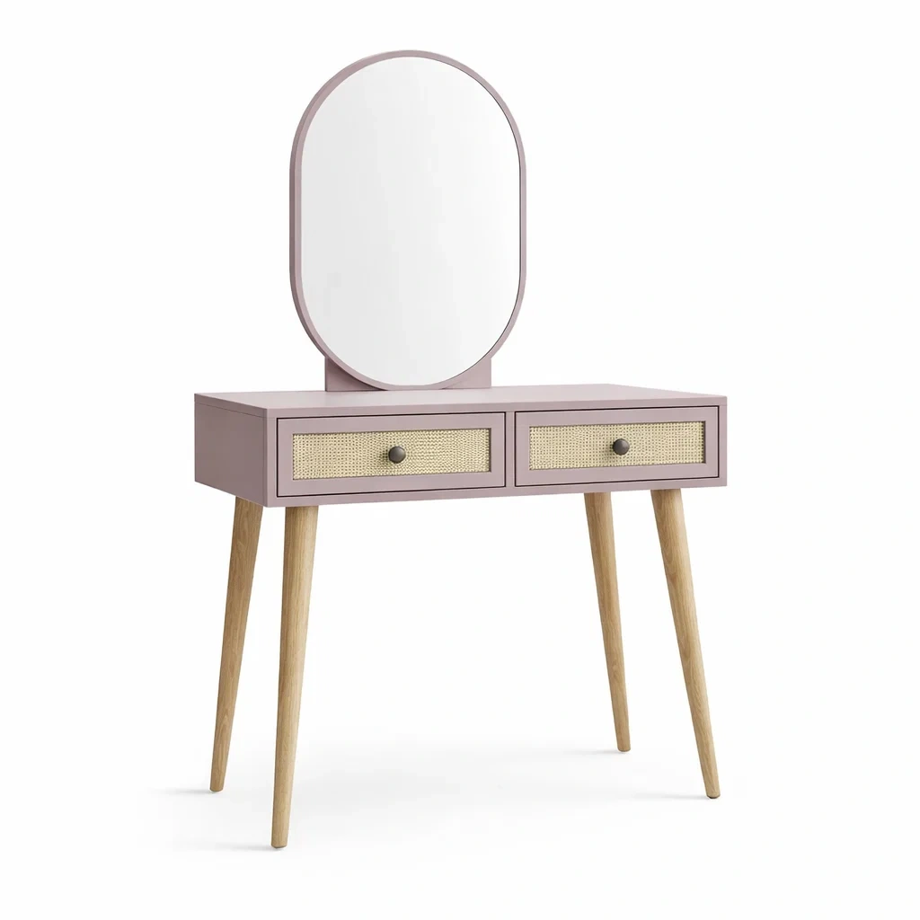 Coiffeuse en bois avec miroir ovale et tiroirs en rotin