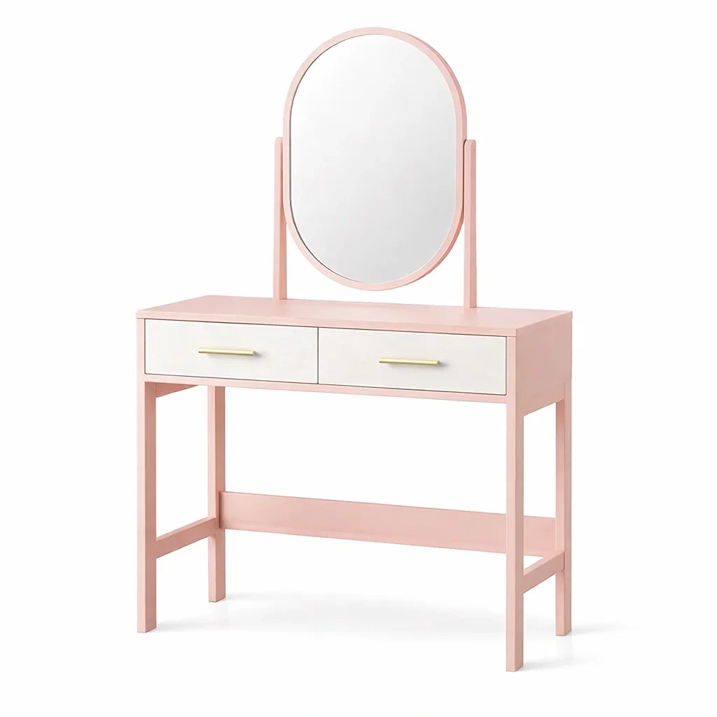Cette coiffeuse est fabriquée en bois MDF rose avec des poignées en métal doré et un miroir en verre trempé transparent. Les tiroirs sont en panneau MDF blanc. Elle mesure 100 cm de long, 40 cm de large et 130 cm de haut.