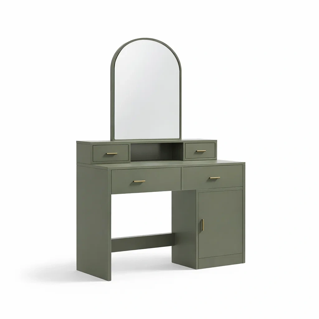 Structure en MDF avec un miroir en verre trempé. Poignées de tiroir en métal.