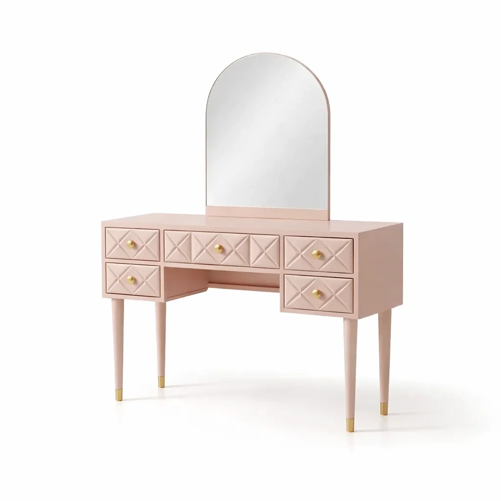 Cette coiffeuse est fabriquée en MDF avec un miroir en verre trempé. Elle dispose de six tiroirs pour le rangement.