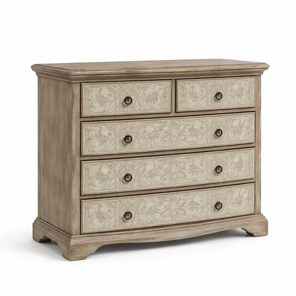 Cette commode en bois comporte cinq tiroirs avec des motifs floraux décoratifs. Les tiroirs sont en MDF et présentent une finition patine antique.