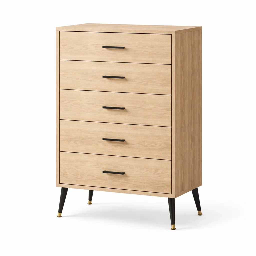 Commode en bois chêne clair avec 5 tiroirs et métal noir