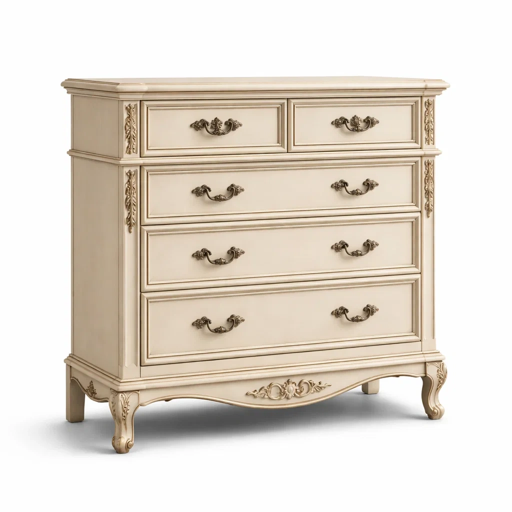 La commode est fabriquée en bois massif avec un fini laqué. Elle possède cinq tiroirs coulissants équipés de poignées en alliage de zinc.