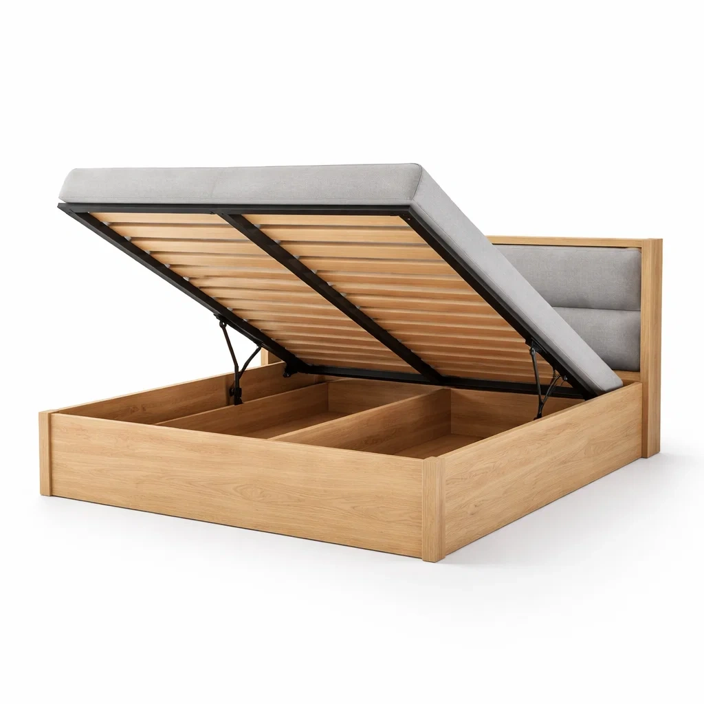 Ce lit intègre un coffre de rangement spacieux sous le sommier, idéal pour stocker vêtements ou literie. Le cadre est fabriqué en bois plaqué chêne, tandis que la tête de lit est rembourrée dans un tissu polyester gris. La structure en métal assure une stabilité optimale, avec une capacité de charge de 150 kg.