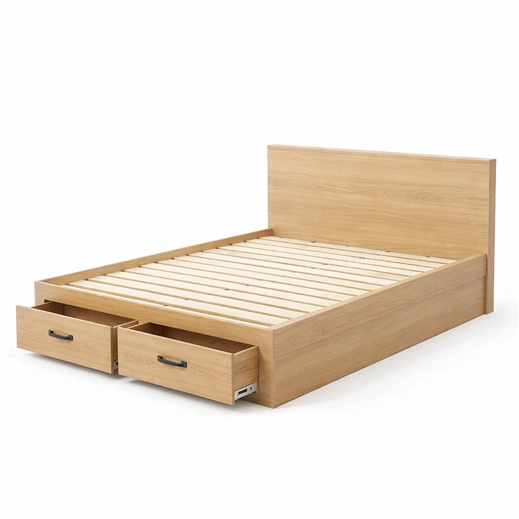 Le produit inclut deux tiroirs de rangement intégrés et un sommier à lattes.