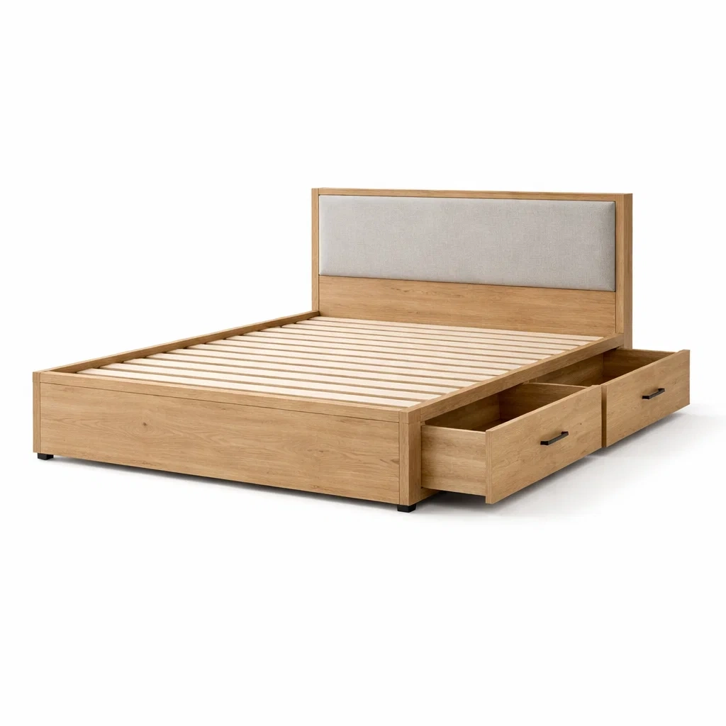 Structure en bois avec lattes et deux tiroirs de rangement latéraux.