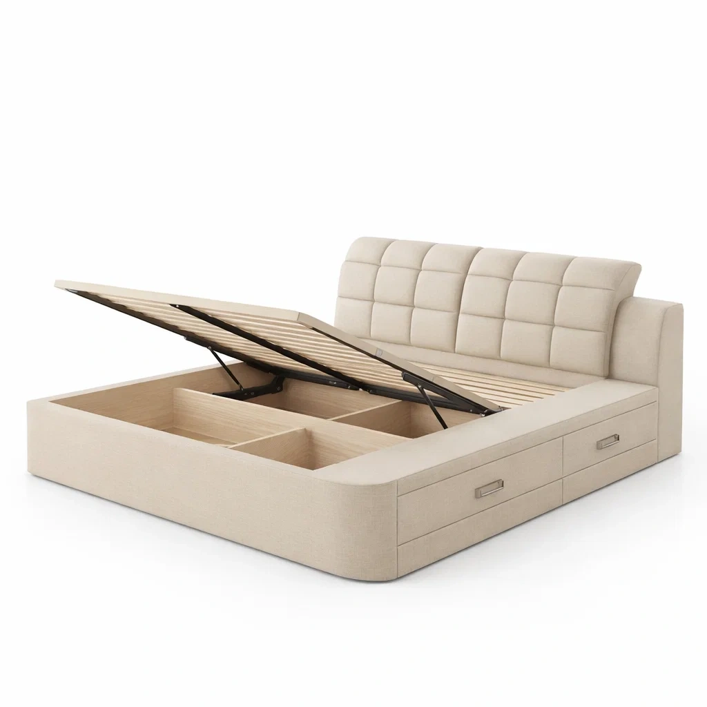 Lit avec rangement en bois et tissu polyester beige