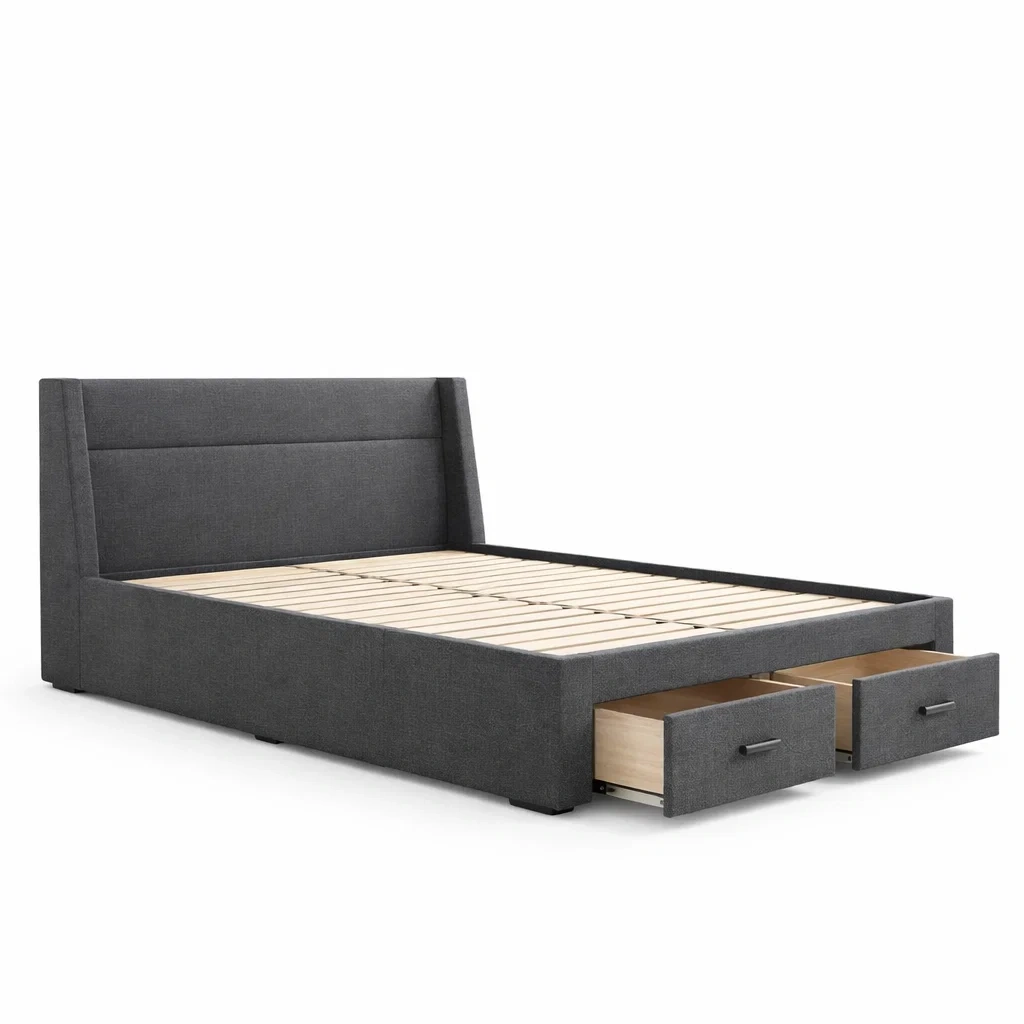 Caractéristiques : Deux tiroirs de rangement intégrés, tête de lit rembourrée en mousse.