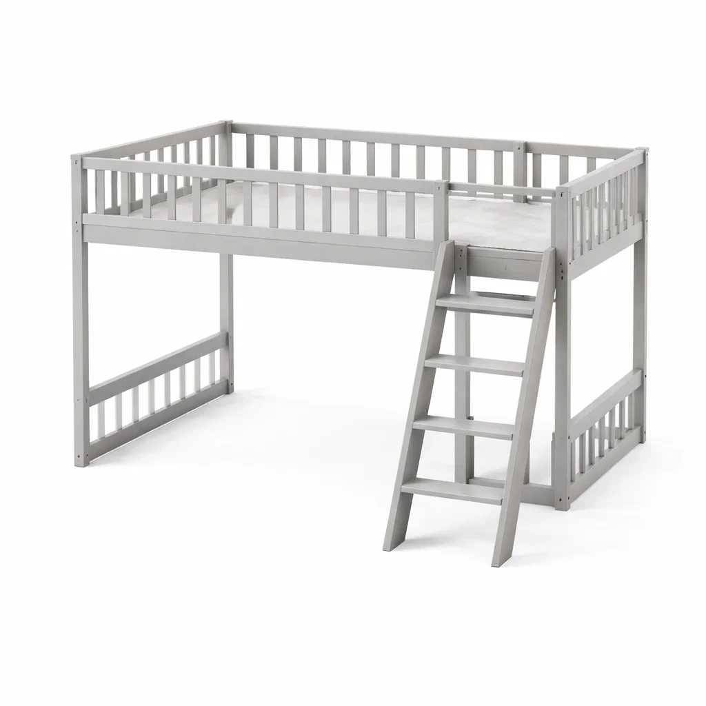 Le lit mezzanine est fabriqué en bois de pin massif, assurant robustesse et durabilité. Sa finition gris s'harmonise aisément avec différents styles.